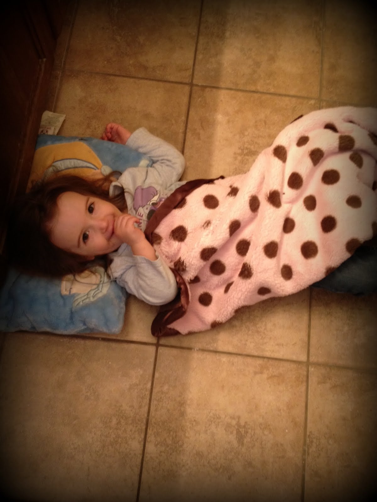 This story is for all you mom's out there: Sunday, Travis had to go do a little work in the afternoon. So, it was just me and the girls. I was using the bathroom and in walks Catherine with her pillow and blankie. (I wasn't in there that long!) She made a little pallet in the floor. Ahh...being a mom = never getting to use the bathroom alone again. :)